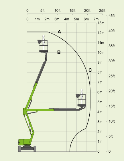 In die HR12LE sind auch der Niftylift ToughCage und das mehrfach ausgezeichnete Sicherheitssystem SiOPS® inkorporiert: Die schlagzähe Verbundwerkstoff- / Aluminiumbasis und das Stahlgeländer des ToughCage mit größerem Querschnitt geben zusätzliche Festigkeit und Langlebigkeit. SiOPS® bietet durch Eliminieren von anhaltend unwillkürlichem betriebzusätzlichen Bedienerschutz, indem es sofort alle Maschinenbewegungen unterbindet, wenn der Bediener gegen das Bedienpult gedrückt wird.