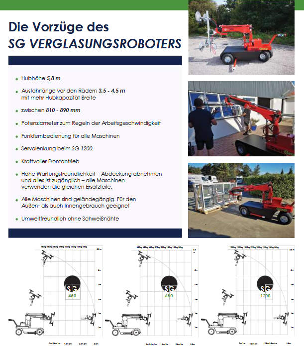 Hubhöhe 5,8 m, Ausfahrlänge vor den Rädern 3,5 – 4,5 m, mit mehr Hubkapazität Breite zwischen 810 – 890 mm, Potenziometer zum Regeln der Arbeitsgeschwindigkeit, Funkfernbedienung für alle Maschinen Servolenkung beim SG 1200. Kraftvoller Frontantrieb