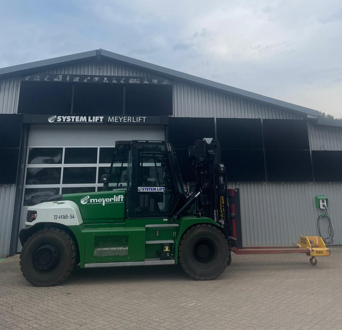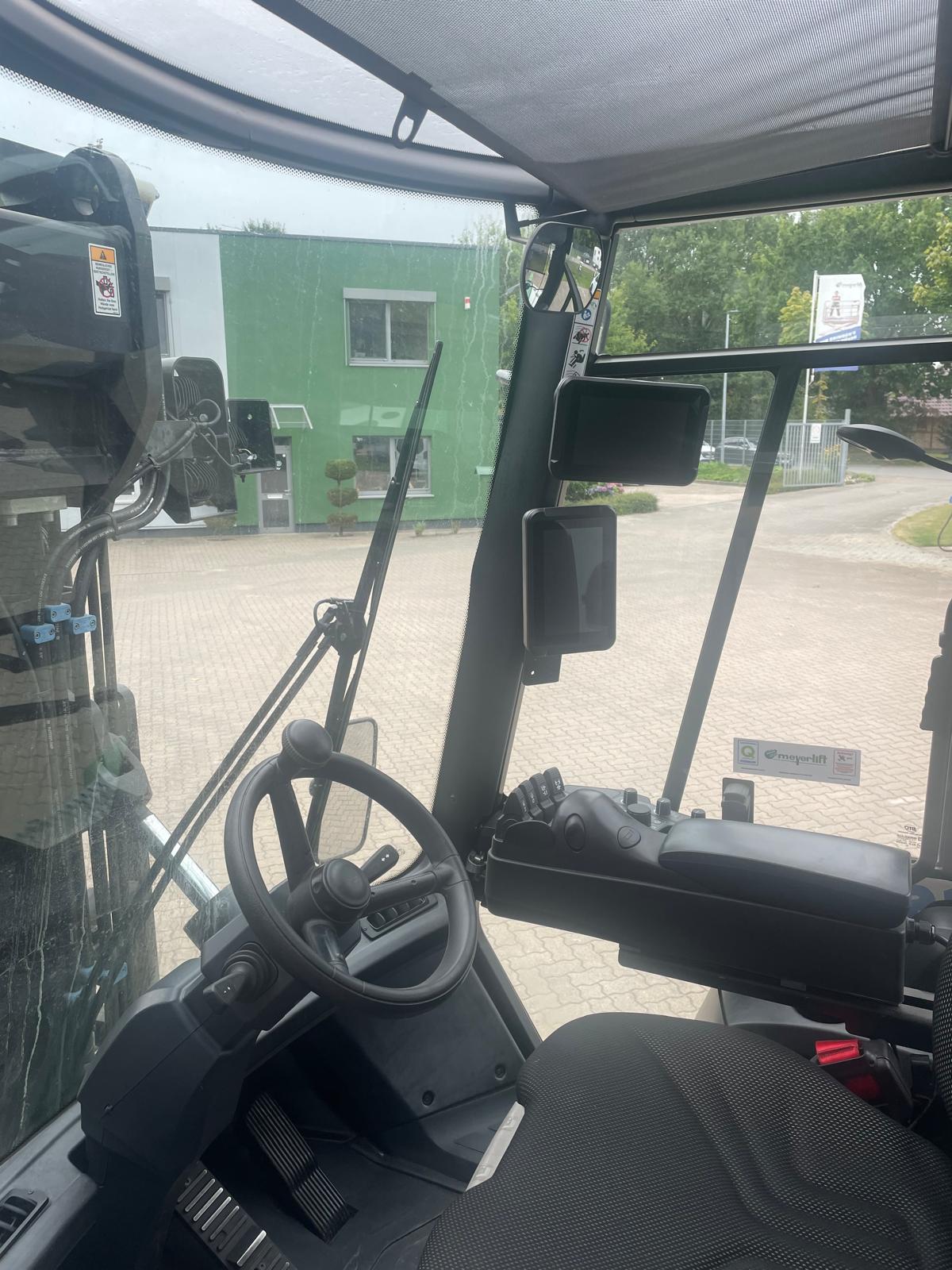 Hubmast: Dreifach mit Freihub (Triplex) Hubhöhe: 4.500 mm Bauhöhe min.: 3.110 mm (Hubgerüst voll eingefahren) Freihub: 1.330 mm Mastneigung: 15° vorwärts/ 10° rückwärts Gabelträger: 2.498 mm Anbaugerät: Seitenschieber mit simultaner und individueller Zinkenverstellung Gabelzinken: 2.440 x 200 x 90 mm Motor: MTU Mercedes OM934, 5,1l, Stufe V, Nennleistung 129 kW bei 1.800 U/min Getriebe: ZF 3 WG 161 3 Gang vorwärts/3 Gang rückwärts Bremse: Ölbadlamellenbremse Bedienhebel: Hydraulische Bedienelemente (4 Hebel+ 2 Schalter) Fahrtrichtungswechsel: integrierter Fahrtrichtungsschalter (in Armlehne) Bereifung: Diagonal-Luftbereifung 12.00-20 20PR Beleuchtung: 2 LED Arbeitsscheinwerfer am Mast, 2 LED Arbeitsscheinwerfer nach hinten, 2 LED Fahrscheinwerfer an den vorderen Kotflügeln, 2 LED Rückleuchten mit Bremsleuchte Schlusslicht Rückscheinwerfer, Fahrtrichtungsanzeiger Sonstige Ausstattung: Geschlossene Kabine mit Klimaautomatik, Druckabhängiges Absenken, Einzelblattscheibenwischer Frontscheibe, Luftgefederter Stoffsitz Typ Deluxe AIR Ride mit hoher Rückenlehne, 2 Weitwinkel Außenspiegel am Kabinenhandlauf, Akustischer Rückfahralarm – Aktivierung bei Rückwärtsfahrt, Sonnenrollos oben und hinten, 7 Zoll Farbdisplay, Tankdeckel verschließbar, Verschließbarer Batterietrennschalter, Ohne Lastschutzgitter, 6 Funktionen (4 Zusatzfunktionen), Radmutterschutzring an der Lenkachse, Elektrische Hupe 105 dB(A)
