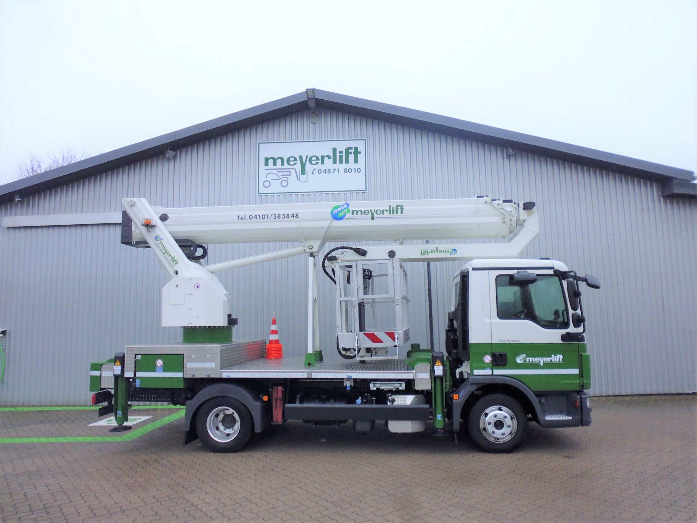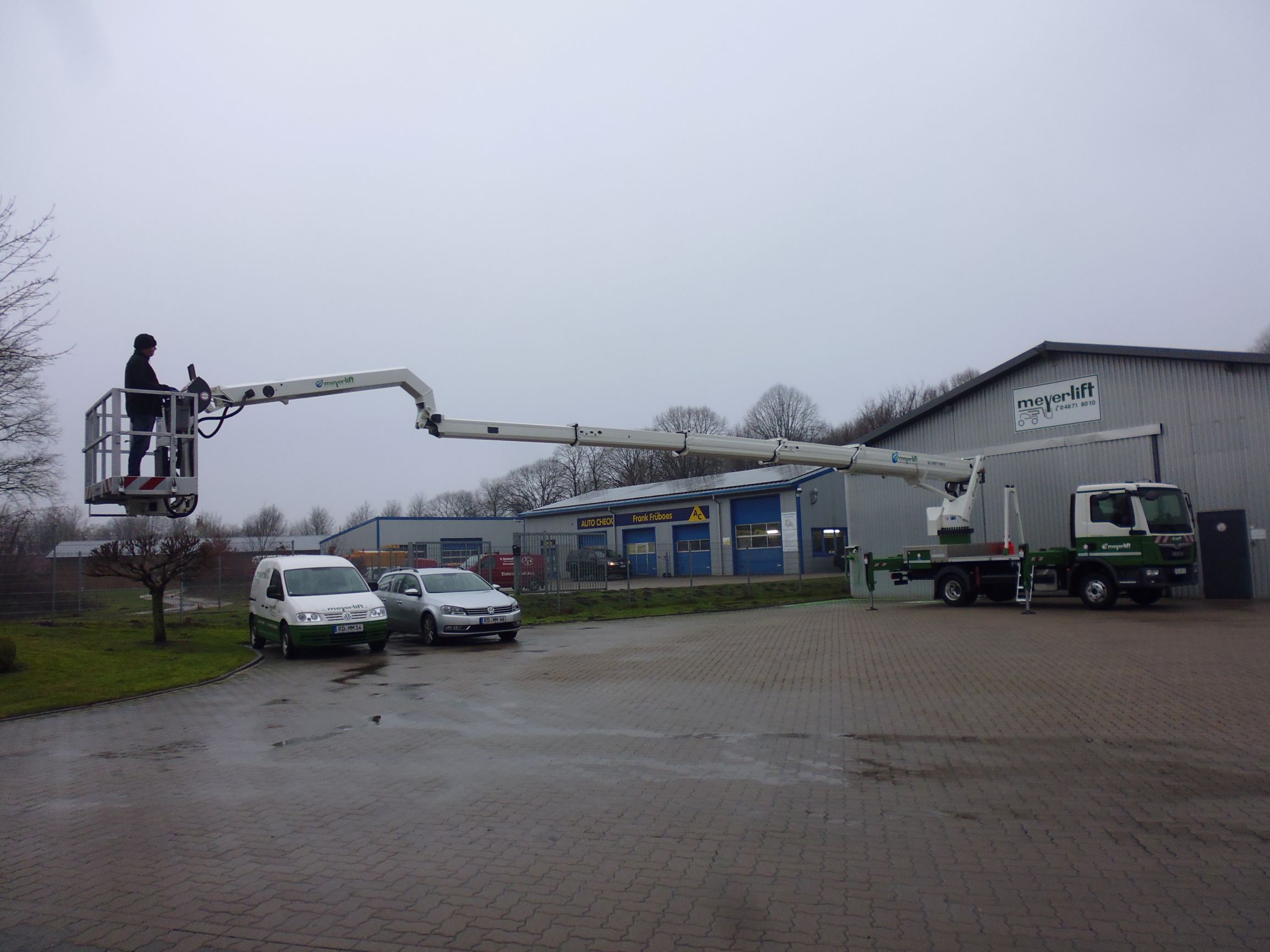 Der unterzogene Oberarm ist, besonders lang konzipiert/konstruiert worden. So kann man beispielsweise über Objekte hinweg teleskopieren, um dann mit dem Oberarm hinter Objekten zu senken und arbeiten zu können. Gleichzeitig kann der LKW extrem nah am Objekt aufgestellt und abgestützt werden.