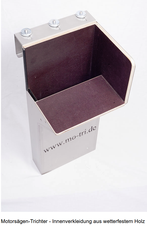 Der Motorsägen-Trichter (Mo-Tri) ist ein Halter, der im Korb einer Arbeitsbühne befestigt wird und somit einen sicheren Aufbewahrungsort für Motorsägen bei Baumfällungsarbeiten bietet. „Mo-Tri“ besitzt ein stabiles Edelstahlgehäuse, welches innen mit witterungsbeständigem Holz verkleidet ist. Das Gehäuse ist trichterförmig mit Öffnung nach oben gestaltet, so dass es die Motorsäger mit dem Schwert zuerst aufnehmen kann. Die schmale Unterseite ist ebenfalls geöffnet, so dass Sägespäne nach unten herausfallen können. Auf der Rückseite ist eine verstellbare Halterung angebaut, mit Hilfe derer der „Mo-Tri“ an Arbeitsbühnenkörben diverser Hersteller, und damit mit unterschiedlichen Maßen, befestigt werden kann. Mehrjährig im Einsatz erprobt an den gängigen Arbeitsbühnen, welche in Deutschland eingesetzt werden.
