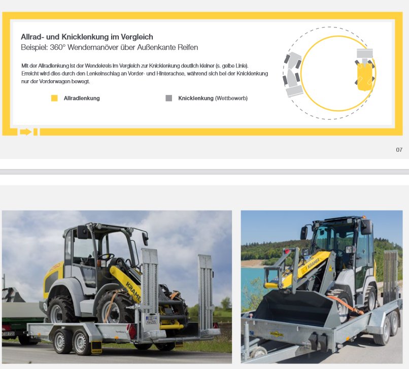Das Kramer System: Der ungeteilte Rahmen und die bewährte Kramer Allradlenkung sorgen für optimale Standsicherheit und maximale Nutzlast auch auf unebenem Gelände
