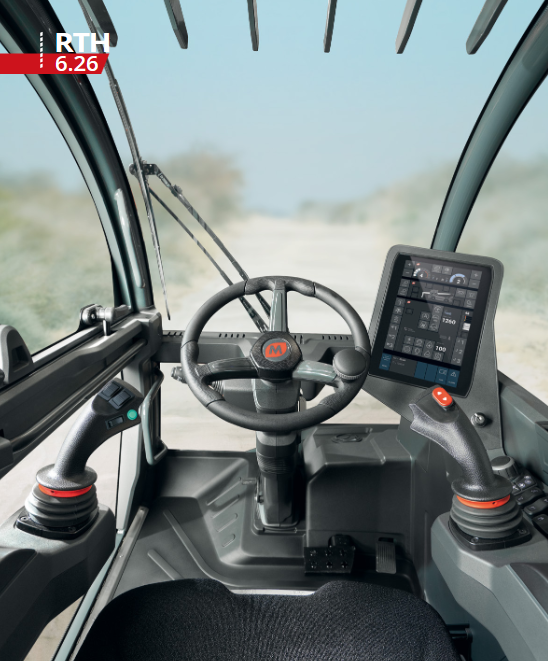 Als 3-in1 Maschinen konzipiert ermöglichen der RTH 6.26 urch einfaches Wechseln des Anbaugeräts den Einsatz als Teleskopstapler mit Palettengabel, als Kran durch Anbringen einer Winde und als Hubarbeitsbühne durch den Anbau eines Arbeitskorbes. Die automatische Magni Anbaugeräte-Erkennung RFID identifiziert das jeweils montierte Gerät, lädt das entsprechende Lastdiagramm und stellt die Lastmomentbegrenzung ein. Dabei überwacht eine Lastmomentanzeige die Bewegungen der Maschine kontinuierlich, um jede Art von Überlast zu vermeiden. Auch der Innenraum der Kabine wurde komplett neugestaltet und dank der im Spritzgussverfahren hergestellten Verkleidungen nicht nur strukturiert und ergonomisch angeordnet, sondern überzeugen auch durch die verbesserte Haltbarkeit und das gefällige Design. Integrierte, indirekte LED-Beleuchtung schaltet sich beim Öffnen der Tür ein. Sie lassen sich dimmen und erlöschen allmählich, sobald die Maschine ausgeschaltet wird.