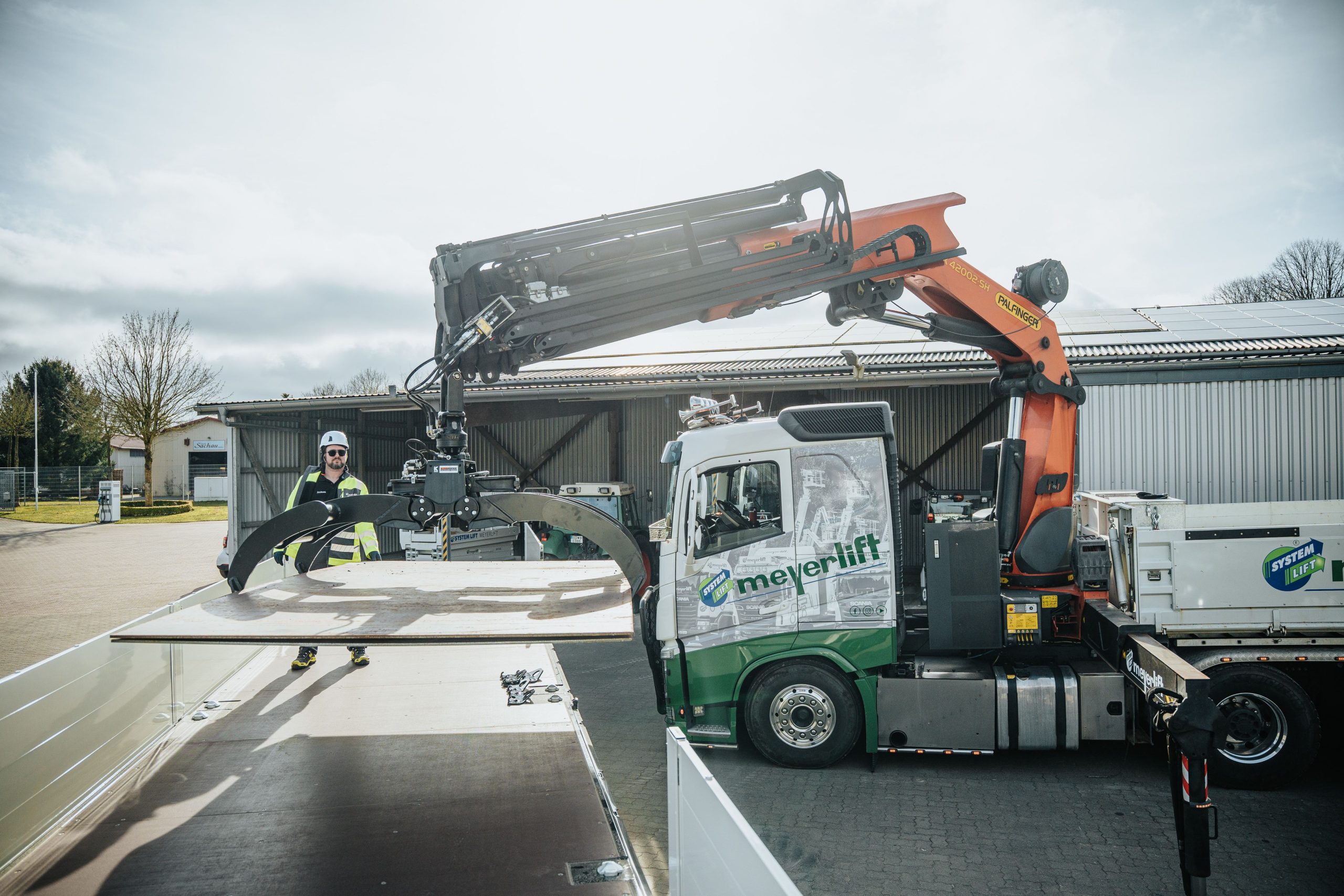 Mit unserem modernen Ladekran sind unsere mobilen Fahrstraßen in kürzester Zeit für Sie verlegt und bringen Sie sauber ans Ziel.