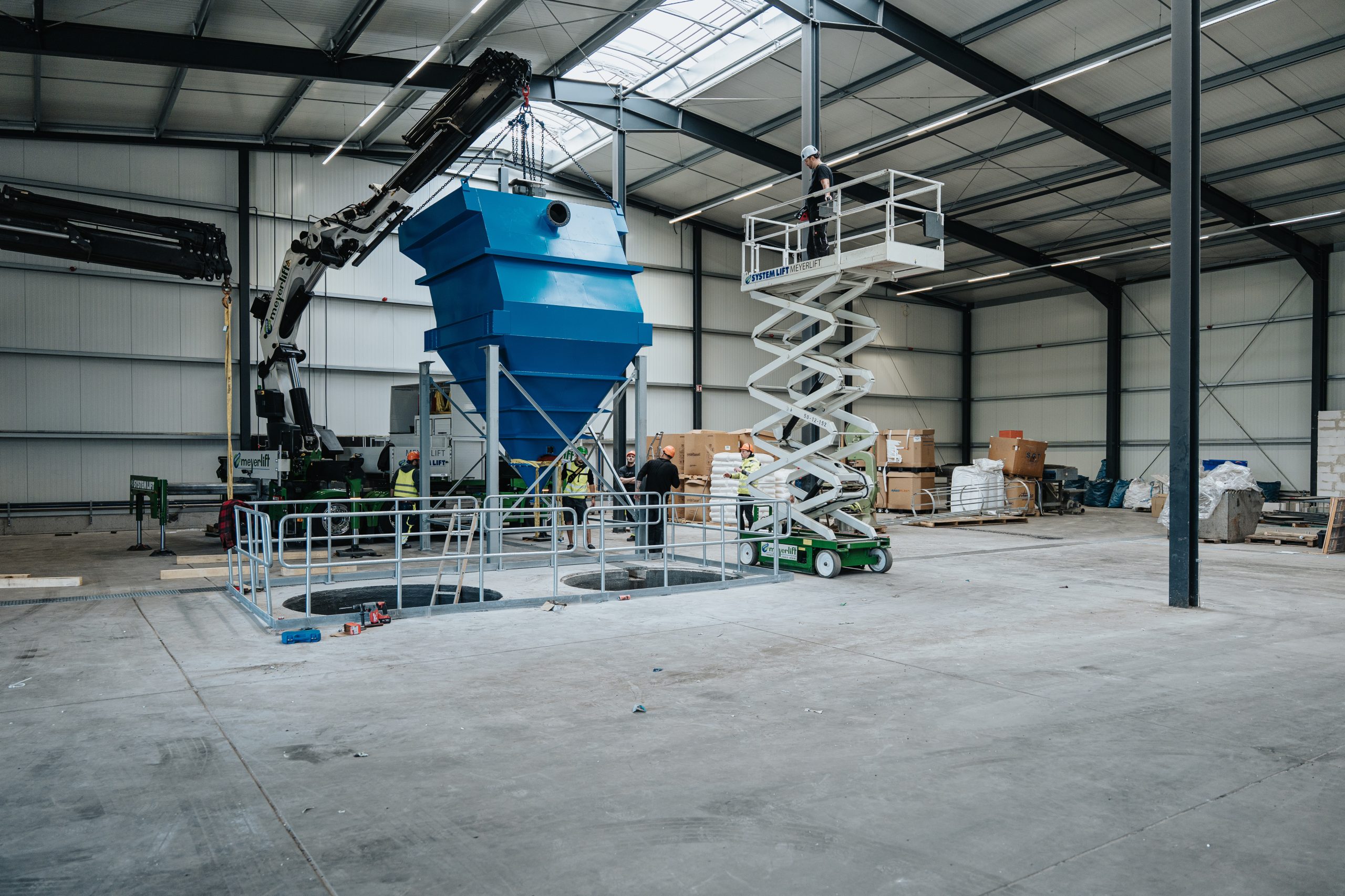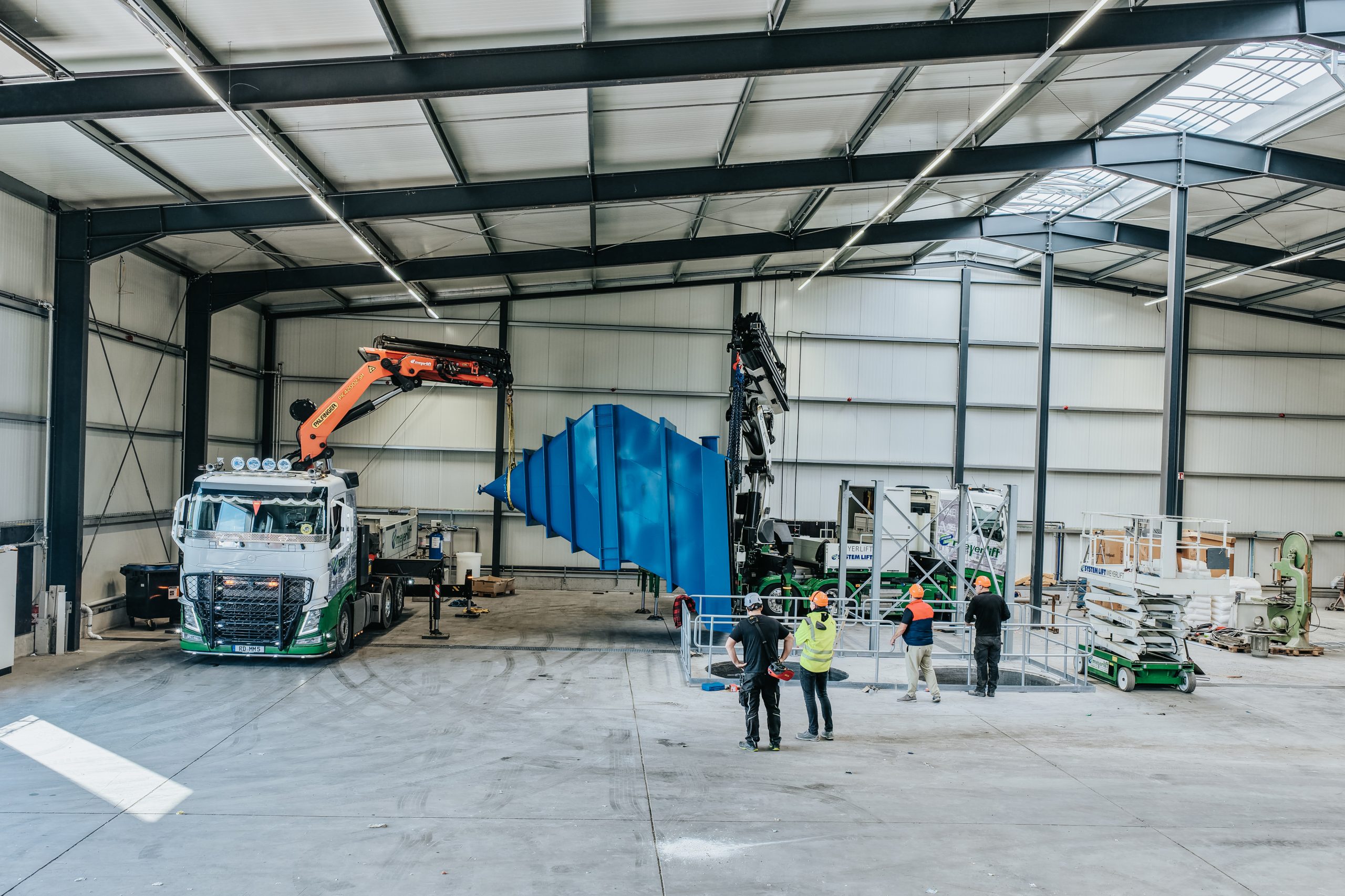 Unsere erfahrenen Kranführer Jan und Philipp arbeiteten synchron und hochkonzentriert. Jeder Handgriff musste sitzen, denn in der beengten Hallenumgebung war kein Platz für Fehler. Während Jan den Trichter sicher in der Schwebe hielt, koordinierte Philipp das Aufrichten – beide Maschinenbewegungen waren exakt aufeinander abgestimmt. So konnte das schwere Bauteil millimetergenau und sicher an seinem Bestimmungsort platziert werden.